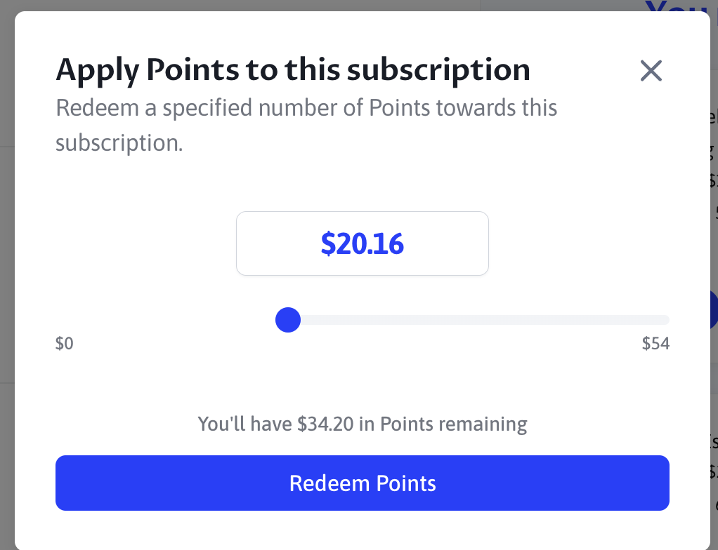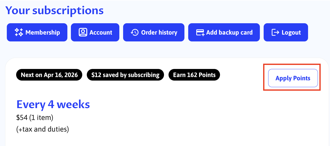 To apply points directly to your subscription go to the "Subscriptions" tab and click "Apply Points"